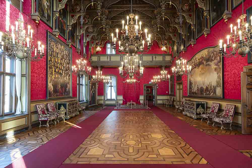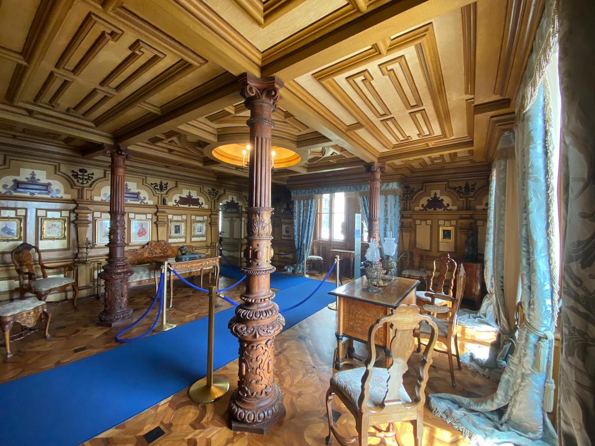 La Sala Novara è uno degli ambienti più evocativi del Castello di Miramare, con una forte connotazione marina. Questa stanza riproduce fedelmente il quadrato di poppa della fregata “Novara,” la nave che Massimiliano utilizzò per il suo celebre viaggio intorno al mondo.Qui, potresti percepire l’odore del legno scuro che riveste completamente le pareti, il soffitto e il pavimento, creando un’atmosfera raccolta e calda, che ricorda quella di una cabina navale. Il legno utilizzato, pregiato e intarsiato, richiama lo stile marinaro e infonde una sensazione di solidità e artigianalità. Sulla parete di destra, vi è uno stipetto indiano, finemente intarsiato con avorio ed ebano. Il mobile, realizzato in legno di canfora, emana un leggero profumo speziato, tipico di questa essenza. Sul lato opposto della sala, grandi finestre si affacciano sulla balconata e lasciano entrare la luce naturale. Un’opera d’arte particolarmente significativa in questa sala è il ritratto di Massimiliano I d’Asburgo, attribuito al grande pittore Dürer. La stanza, illuminata dalla luce naturale che filtra attraverso le finestre, è un perfetto equilibrio tra funzionalità e bellezza artistica, offrendo uno spazio privato dove Massimiliano poteva riflettere sulle sue spedizioni e i suoi sogni di navigatore.